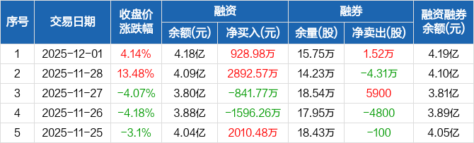 亚光科技融资融券信息显示,2025年12月1日融资净买入928.98万元;融资余额4.18亿元,创近一年新高,较前一日增加2.27%。