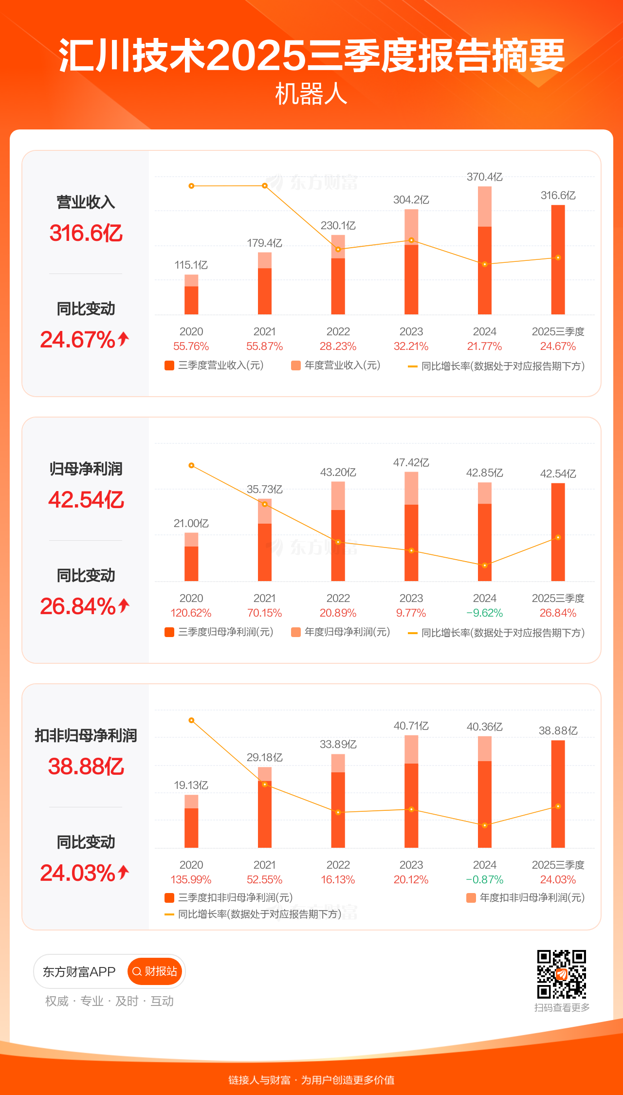 汇川技术10月24日发布2025年三季报显示,公司前三季实现营业收入316.63亿元,同比增长24.67%;归母净利润42.54亿元,同比增长26.84%;扣非归母净利润38.88亿元,同比增长24.03%。