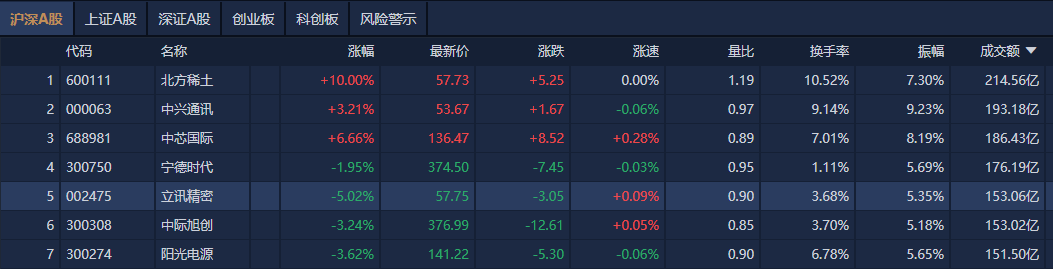 沪深两市成交额2.35万亿,较上一个交易日缩量1609亿。个股方面,北方稀土全天成交额超214亿元居首,中兴通讯、中芯国际、宁德时代、立讯精密等个股成交额均在150亿元以上。