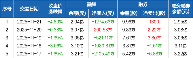 融资方面,当日融资买入1618.75万元,融资偿还2893.38万元,融资净偿还1274.63万元。融券方面,融券卖出4700股,融券偿还3400股,融券余量9.96万股,融券余额73.6万元。融资融券余额合计2.95亿元。