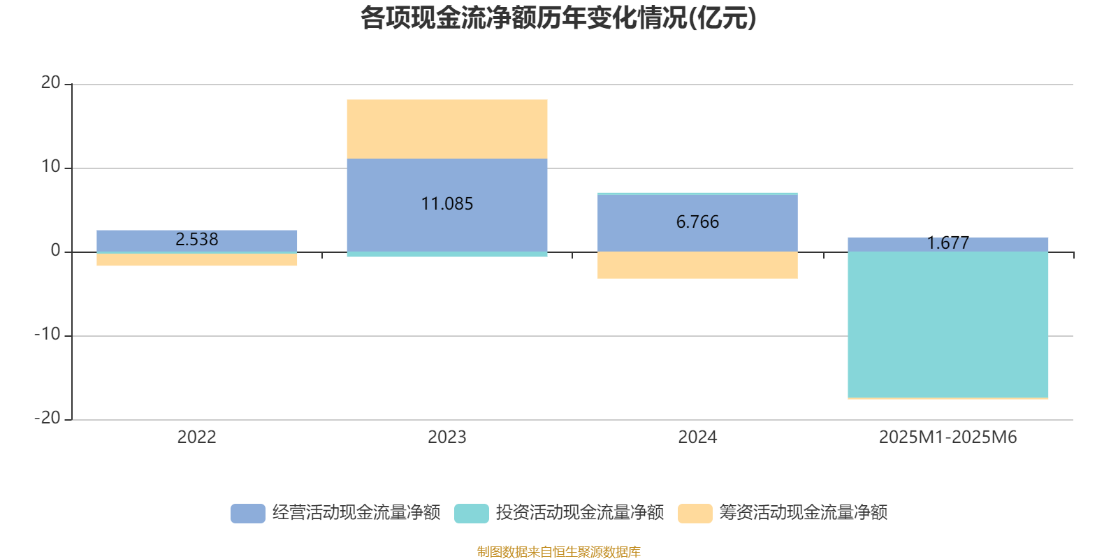 2025年1月至6月,公司经营活动现金流净额为1.68亿元,同比下降29.97%;筹资活动现金流净额-1939.2万元,同比增加1.32亿元;投资活动现金流净额-17.43亿元,上年同期为-1.07亿元。