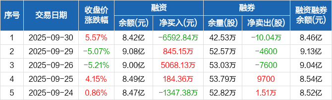融资方面,当日融资买入1.46亿元,融资偿还2.12亿元,融资净偿还6592.84万元。融券方面,融券卖出9500股,融券偿还10.99万股,融券余量42.53万股,融券余额395.1万元。融资融券余额合计8.46亿元。