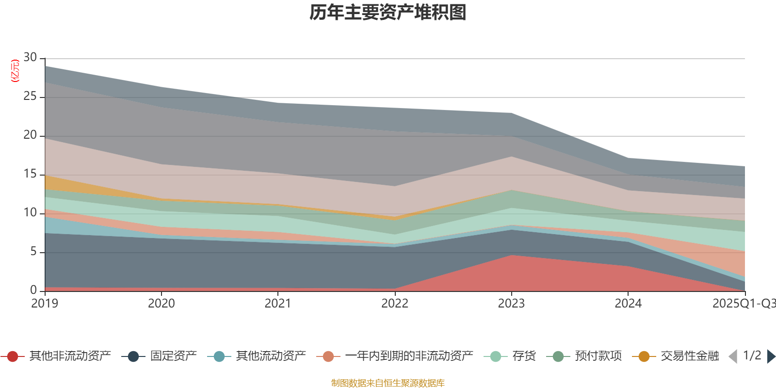 资产重大变化方面,截至2025年三季度末,公司其他非流动资产较上年末减少100%,占公司总资产比重下降18.55个百分点;一年内到期的非流动资产较上年末增加361.99%,占公司总资产比重上升16.38个百分点;固定资产较上年末减少61.91%,占公司总资产比重下降10.88个百分点;存货较上年末增加66.29%,占公司总资产比重上升6.74个百分点。