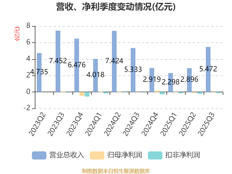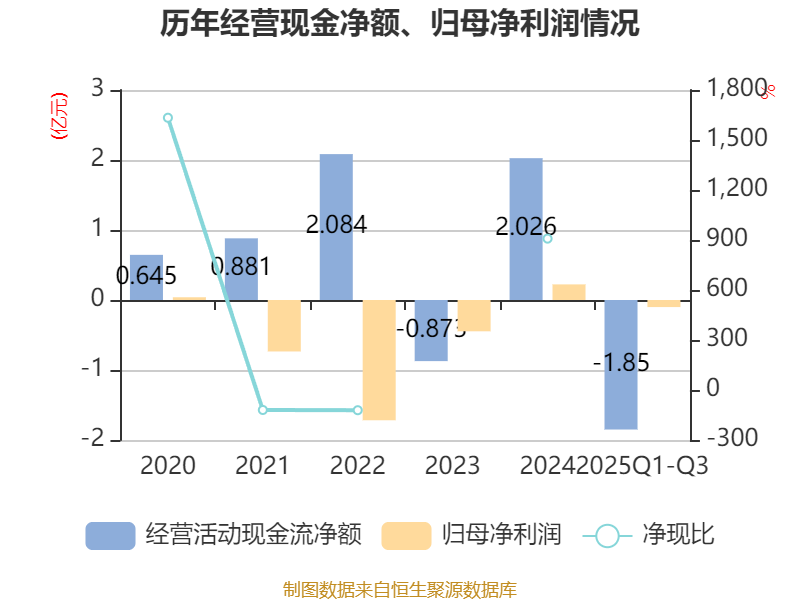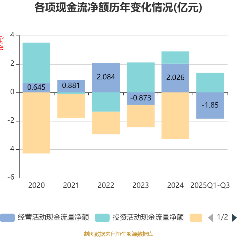 2025年前三季度,公司经营活动现金流净额为-1.85亿元,同比减少3.23亿元;筹资活动现金流净额-347.38万元,同比增加1.42亿元;投资活动现金流净额1.38亿元,上年同期为9598.81万元。
