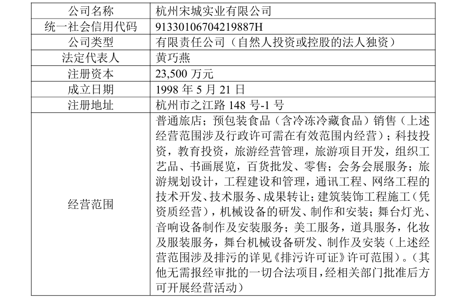据宋城演艺介绍,宋城实业于1998年在杭州市西湖区市场监督管理局登记注册,初始注册资本为1000万元,经过历次变更后注册资本为2.35亿元。宋城实业主要资产为坐落于杭州市之江路148号-1号的土地使用权92431平方米,及地上11幢房屋合计94291.33平方米。