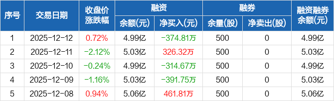 南方泵业:融资净偿还374.81万元,融资余额4.99亿元(12-12)