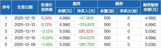 融资方面,当日融资买入799.79万元,融资偿还867.17万元,融资净偿还67.38万元。融券方面,融券卖出0股,融券偿还0股,融券余量500股,融券余额2095元。融资融券余额合计4.98亿元。