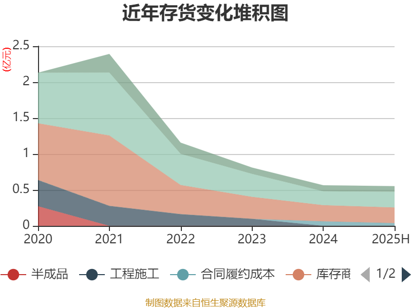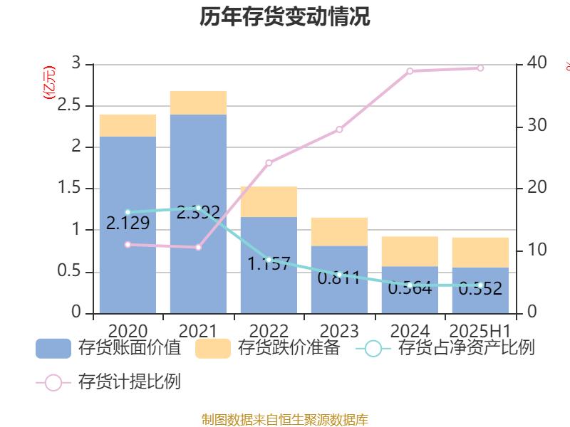 从存货变动来看,截至2025年上半年末,公司存货账面价值为5521.4万元,占净资产的4.48%,较上年末减少120.68万元。其中,存货跌价准备为3581.82万元,计提比例为39.35%。