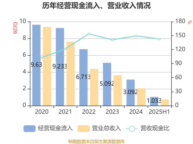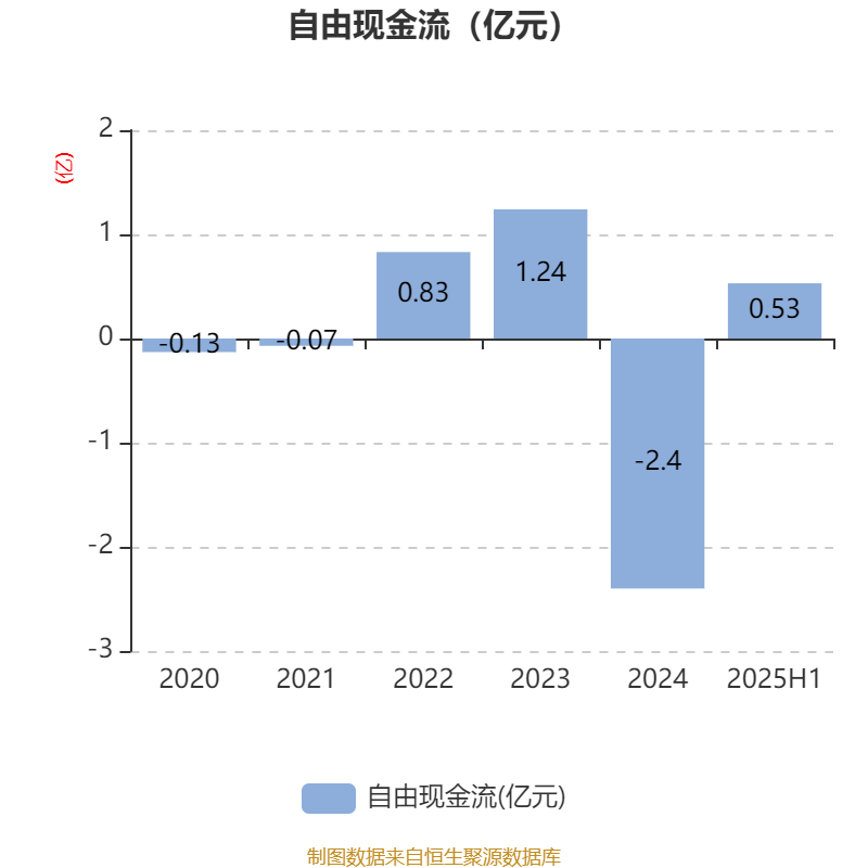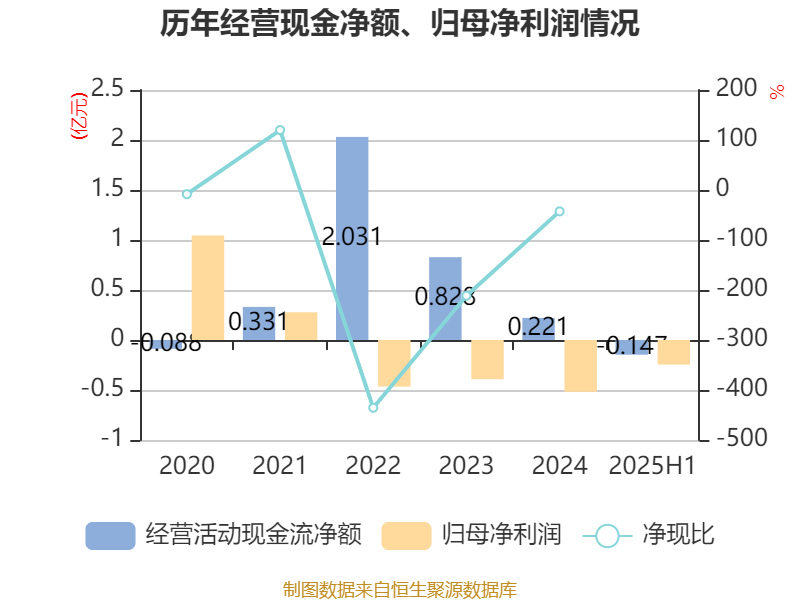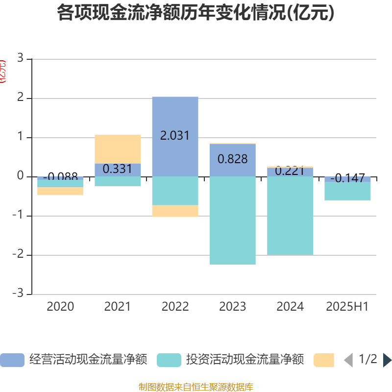 2025年上半年,公司经营活动现金流净额为-1469.46万元,同比减少341.89万元;筹资活动现金流净额-75.35万元,同比减少108.96万元;投资活动现金流净额-4638.02万元,上年同期为3765.75万元。