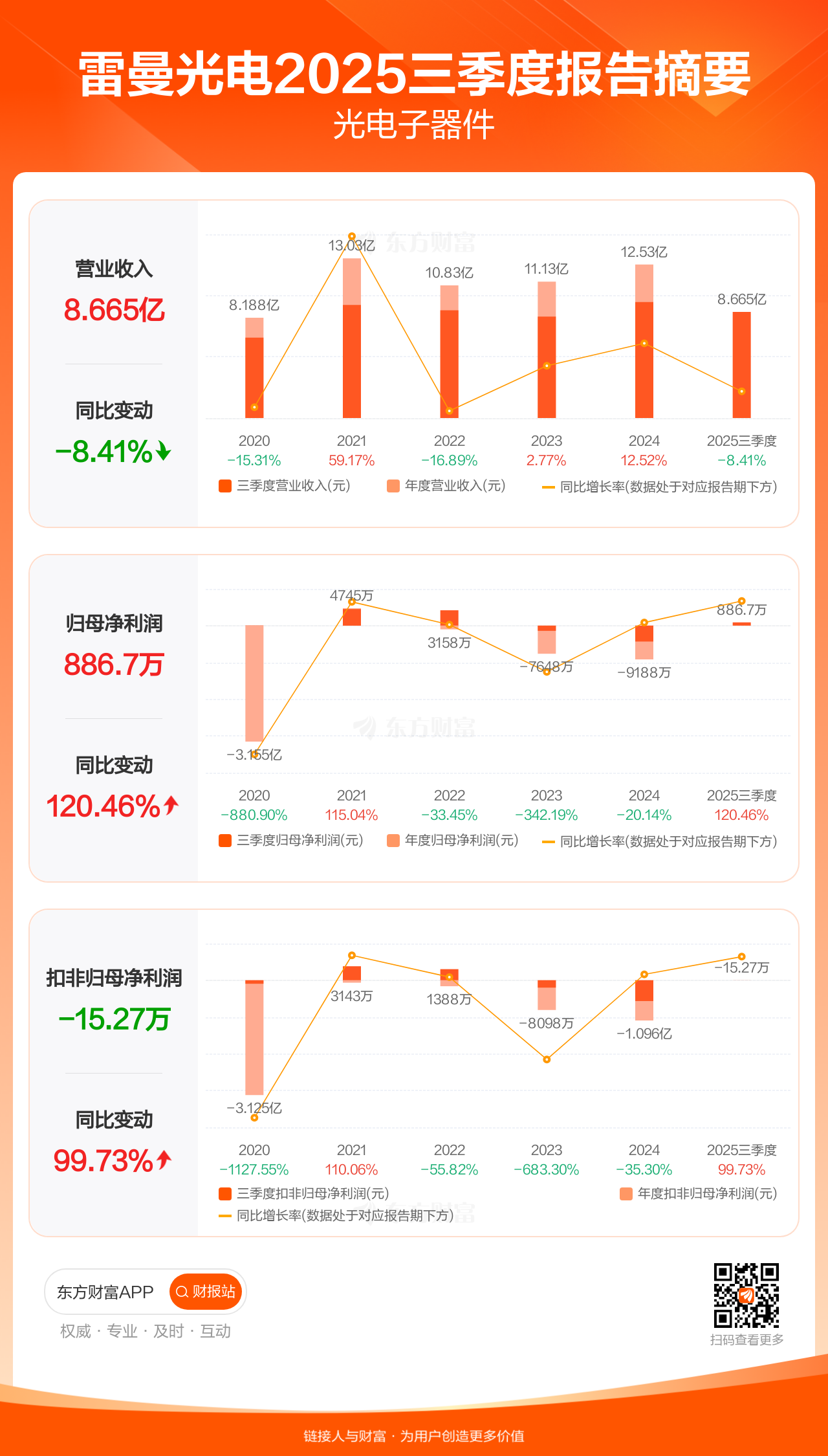 雷曼光电10月29日发布2025年三季报显示,公司前三季实现营业收入8.67亿元,同比下滑8.41%;归母净利润886.66万元,同比增长120.46%;扣非归母净利润-15.27万元。