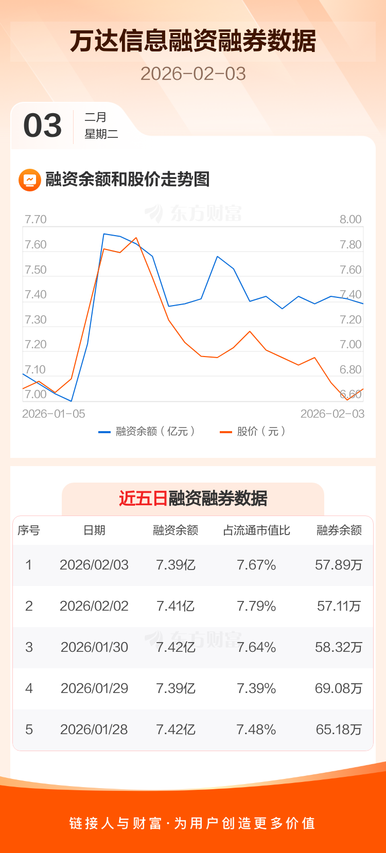 交易所最新数据显示,万达信息于2026年2月3日获融资买入1000.16万元,融资偿还1201.87万元,当日融资净偿还201.71万元。目前,该股融资余额7.39亿,占流通市值比例为7.67%。