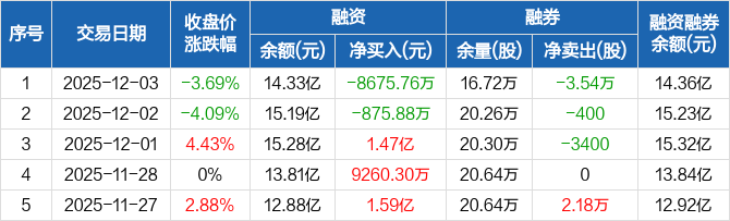 汉得信息:融资净偿还8675.76万元,融资余额14.33亿元(12-03)