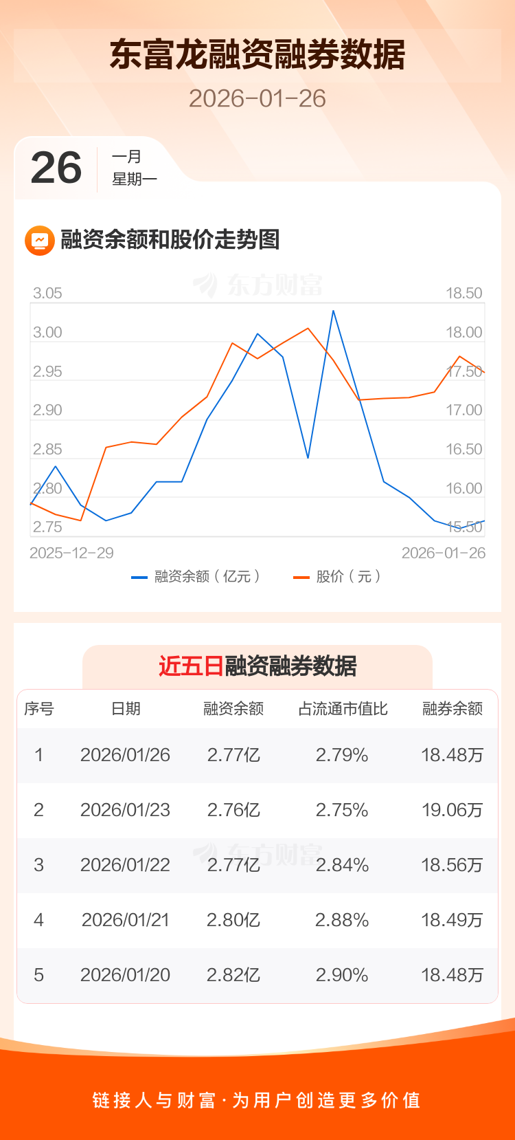 交易所最新数据显示,东富龙于2026年1月26日获融资买入2029.67万元,融资偿还1931.27万元,当日融资净买入98.4万元。目前,该股融资余额2.77亿,占流通市值比例为2.79%。