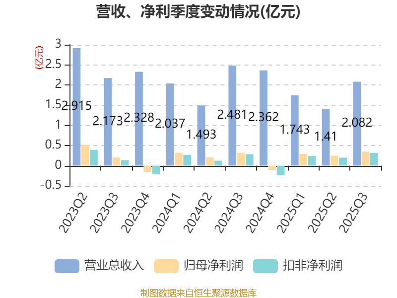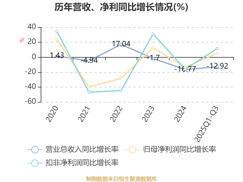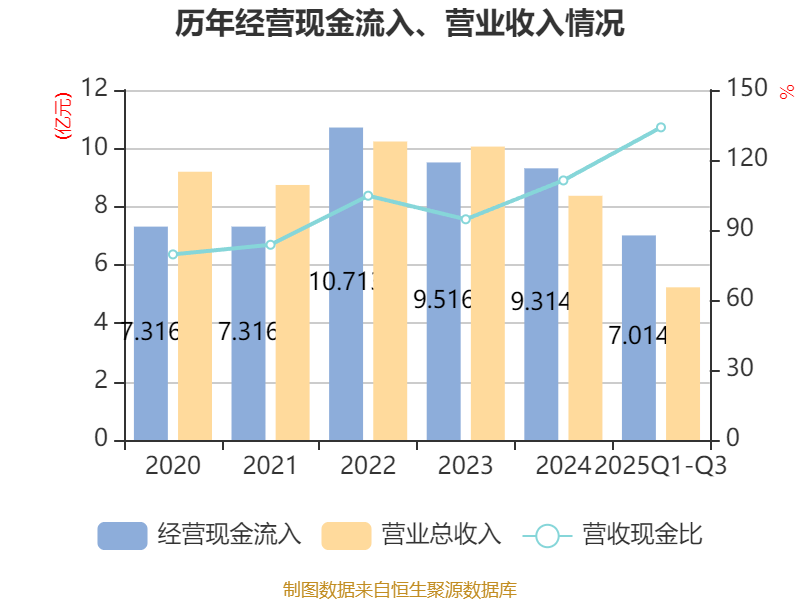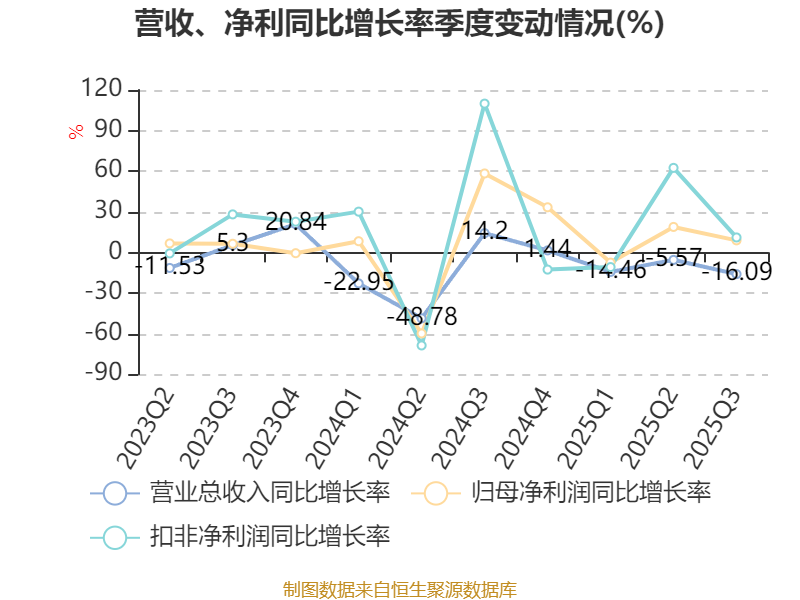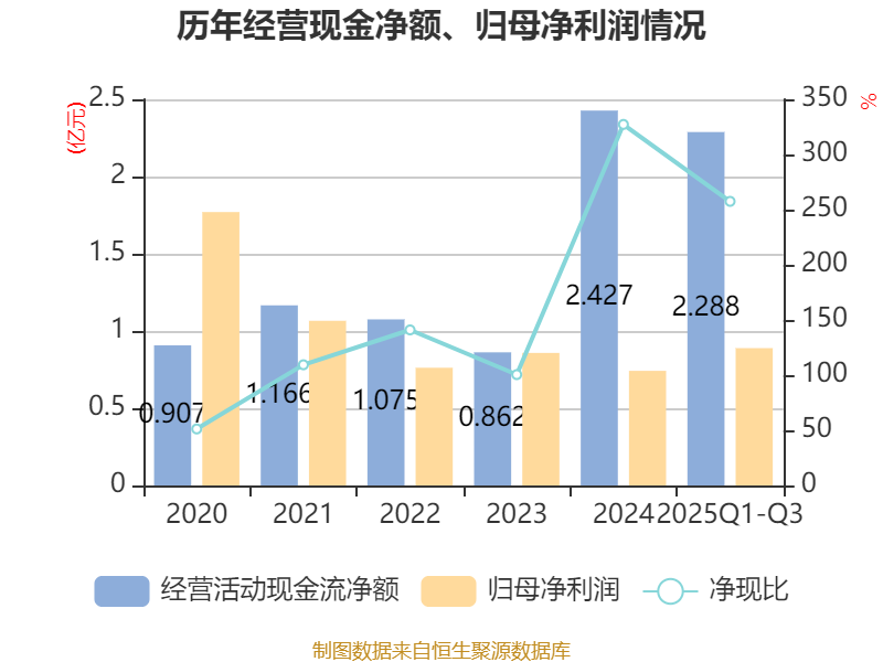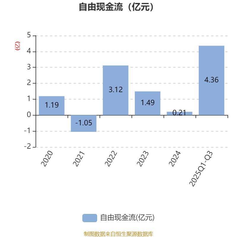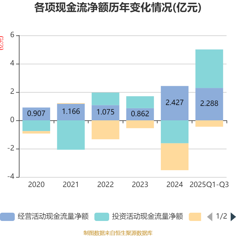 2025年前三季度,公司经营活动现金流净额为2.29亿元,同比增长54.66%;筹资活动现金流净额-4494.25万元,同比增加1.41亿元;投资活动现金流净额2.72亿元,上年同期为3865.58万元。