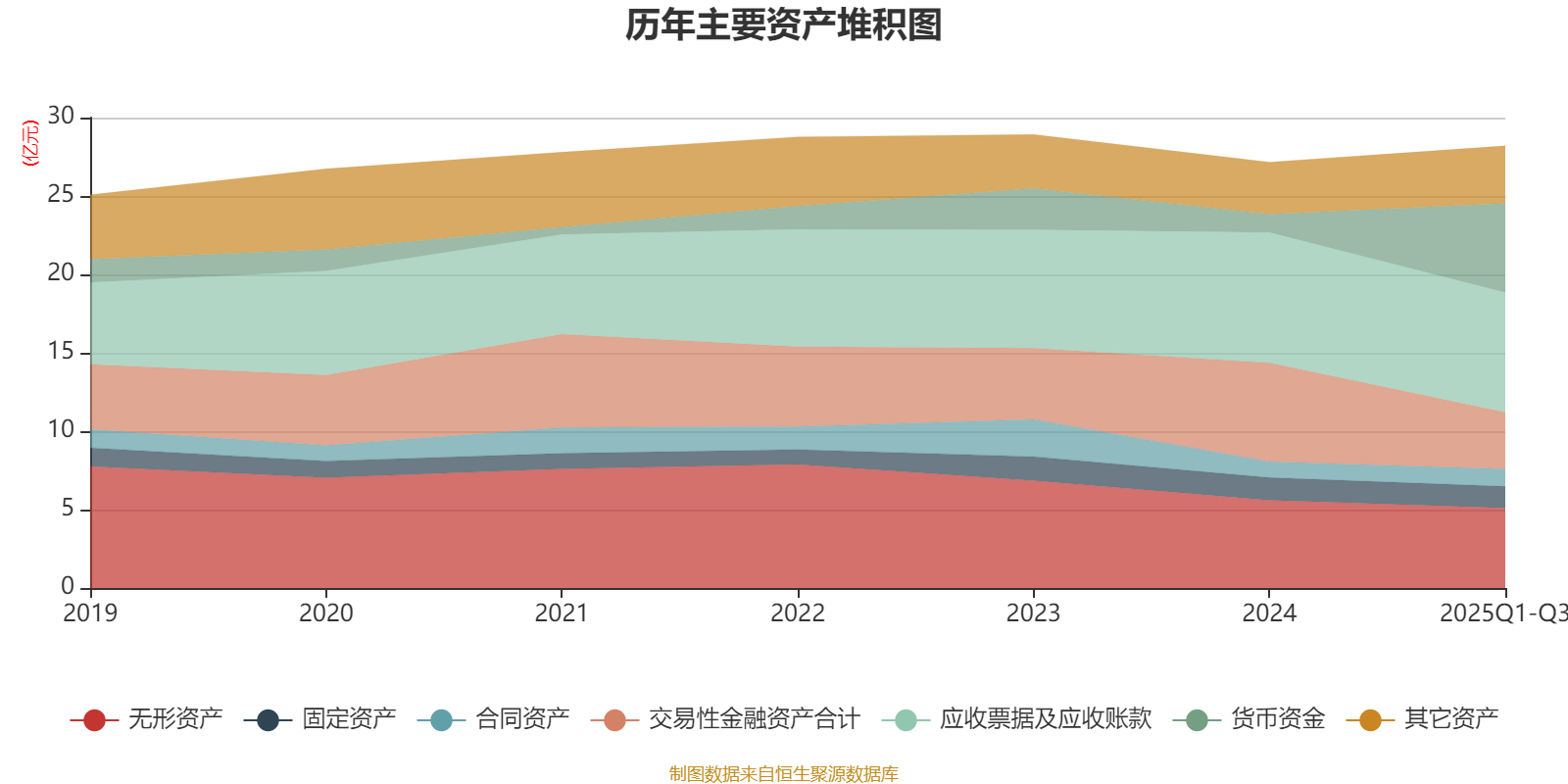 资产重大变化方面,截至2025年三季度末,公司货币资金较上年末增加385.95%,占公司总资产比重上升15.87个百分点;交易性金融资产合计较上年末减少42.71%,占公司总资产比重下降10.39个百分点;应收票据及应收账款较上年末减少7.88%,占公司总资产比重下降3.45个百分点;无形资产较上年末减少8.99%,占公司总资产比重下降2.54个百分点。