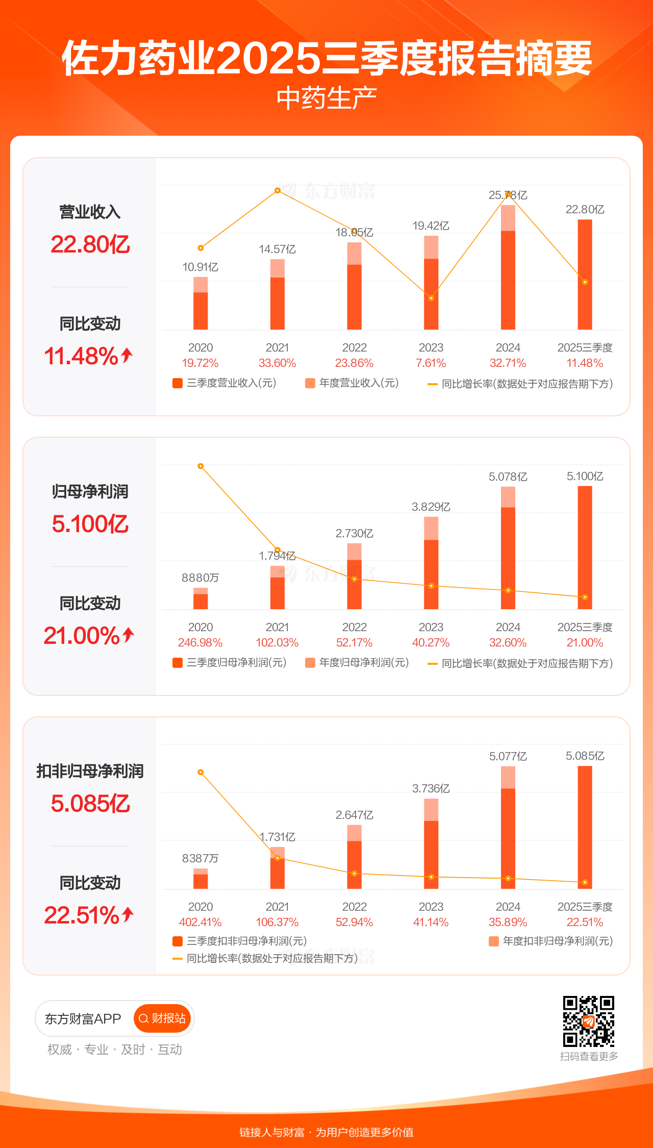 佐力药业10月28日发布2025年三季报显示,公司前三季实现营业收入22.80亿元,同比增长11.48%;归母净利润5.10亿元,同比增长21.00%;扣非归母净利润5.09亿元,同比增长22.51%。