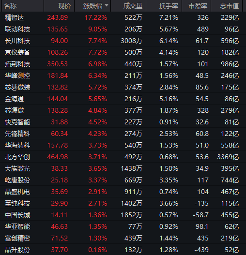 半导体设备板块盘中强势拉升,精智达涨超17%,联动科技、长川科技、京仪装备等跟涨。