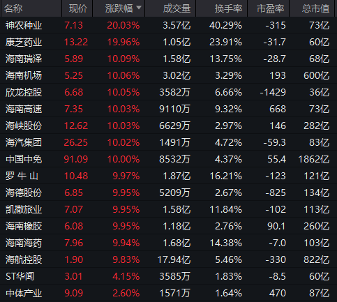 免税概念股集体爆发,神农种业、康芝药业实现20%涨停,中国中免、海南机场、海峡股份等多股涨停。