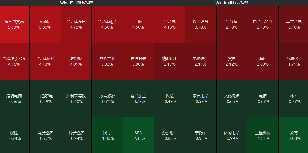 从板块上看,海南自贸港掀起涨停潮,半导体板块盘中拉升,光通信、贵金属、电子元器件等板块表现活跃;而教育、工程机械、银行等板块跌幅居前。