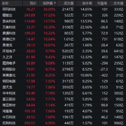 电子元器件板块走强,珂玛科技实现20%涨停,精智达、致尚科技、万集科技均涨超10%,高德红外、易德龙纷纷涨停。