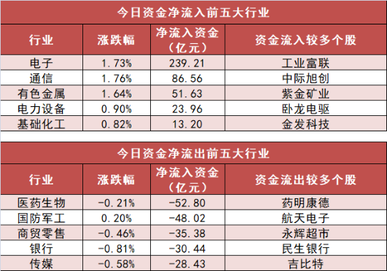 申万一级行业中,10个行业实现资金净流入,其中电子行业净流入239.21亿元居首。