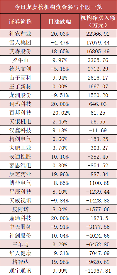 盘后龙虎榜数据显示,机构现身多股,其中神农种业等股票呈现机构资金净买入,通宇通讯等股票呈现机构资金净卖出。