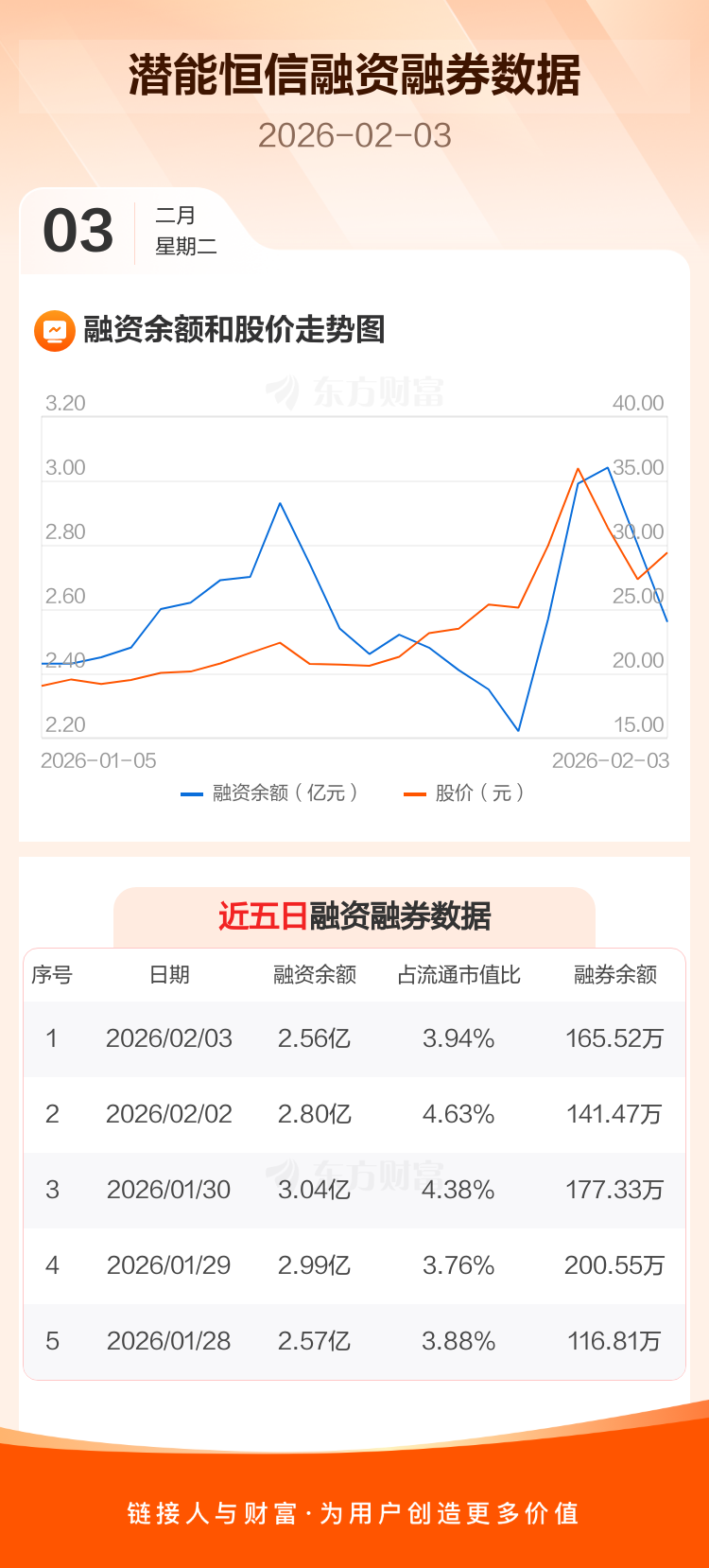 交易所最新数据显示,潜能恒信于2026年2月3日获融资买入6611.85万元,融资偿还8986.53万元,当日融资净偿还2374.68万元。目前,该股融资余额2.56亿,占流通市值比例为3.94%。