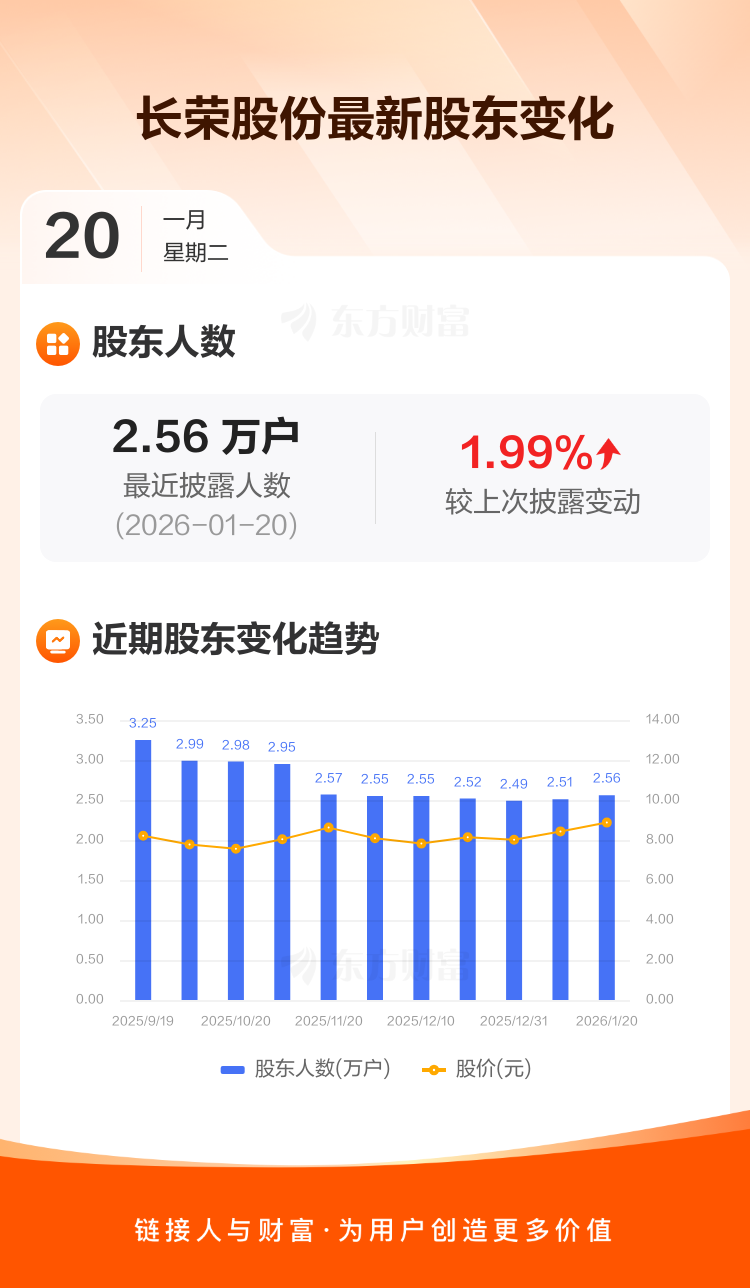 长荣股份最新披露数据显示,截至1月20日公司股东户数为2.56万户,较上期(2026年1月9日)增加499户,增幅为1.99%。户均持有流通股数量由上期的1.25万股下降至1.23万股,户均持股金额由上期的10.54万元增加至10.87万元。