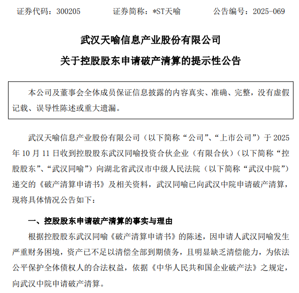 *ST天喻(300205)10月13日午间公告,公司于2025年10月11日收到控股股东武汉同喻投资合伙企业(有限合伙)向湖北省武汉市中级人民法院(以下简称“武汉中院”)递交的《破产清算申请书》及相关资料,武汉同喻已向武汉中院申请破产清算。