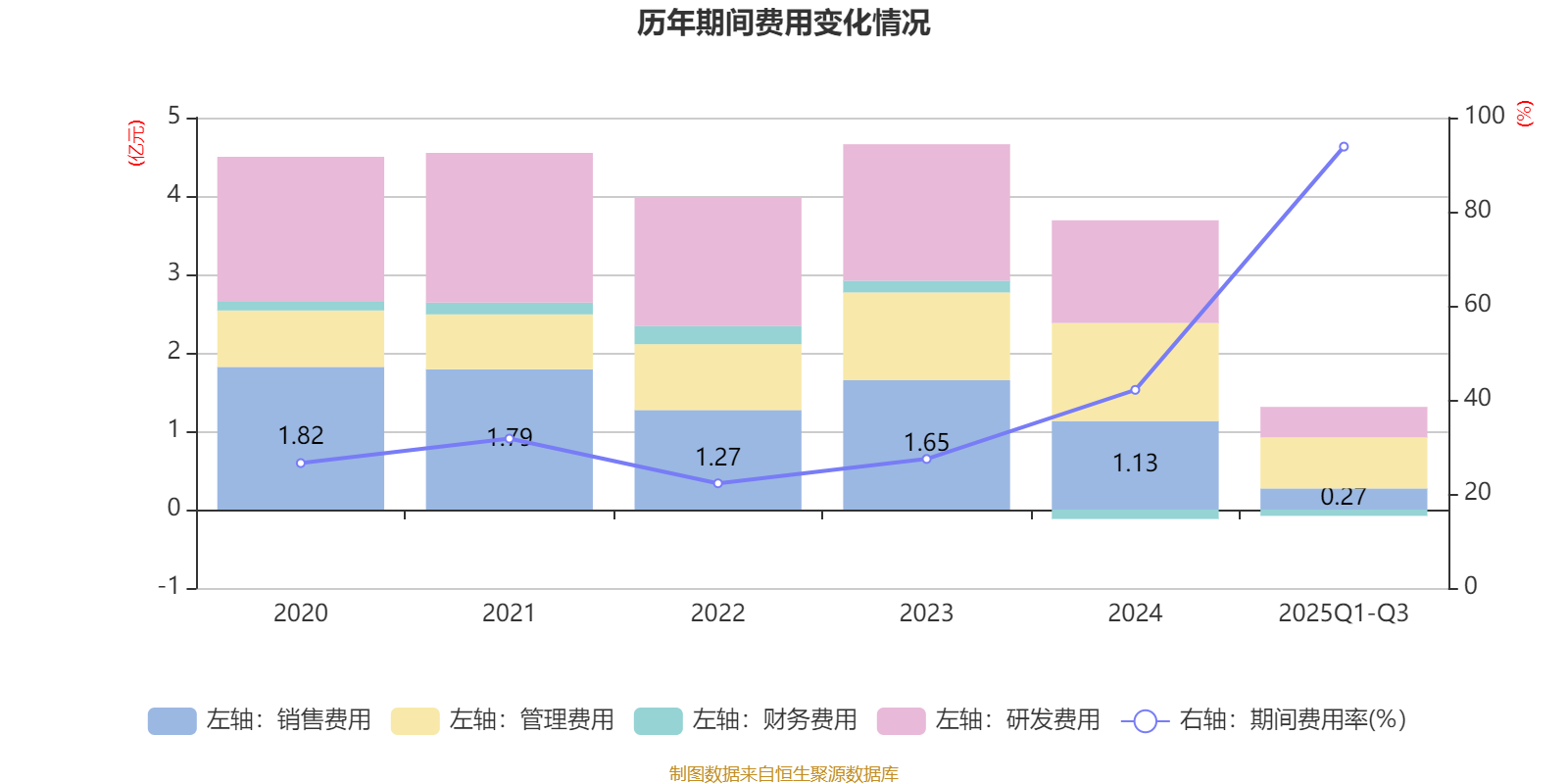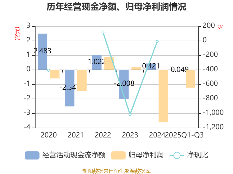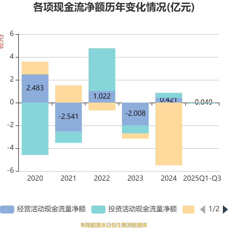 2025年前三季度,公司经营活动现金流净额为-491.26万元,同比增加2.18亿元;筹资活动现金流净额753.46万元,同比增加2.41亿元;投资活动现金流净额-328.78万元,上年同期为1964.3万元。