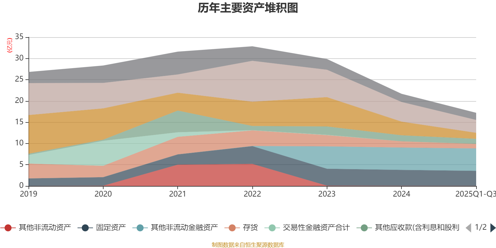 资产重大变化方面,截至2025年三季度末,公司应收票据及应收账款较上年末减少55.62%,占公司总资产比重下降6.53个百分点;其他非流动金融资产较上年末没有变化,占公司总资产比重上升6.31个百分点;货币资金较上年末减少34.49%,占公司总资产比重下降3.72个百分点;固定资产较上年末减少5.25%,占公司总资产比重上升3.34个百分点。