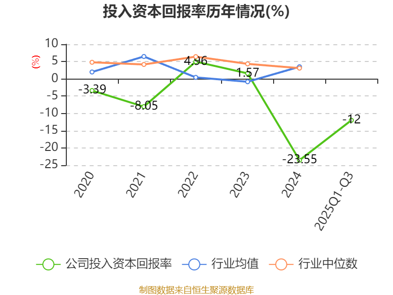 盈利能力方面, 2025年前三季度公司加权平均净资产收益率为-11.91%,同比下降3.96个百分点。公司2025年前三季度投入资本回报率为-12%,较上年同期下降5.17个百分点。