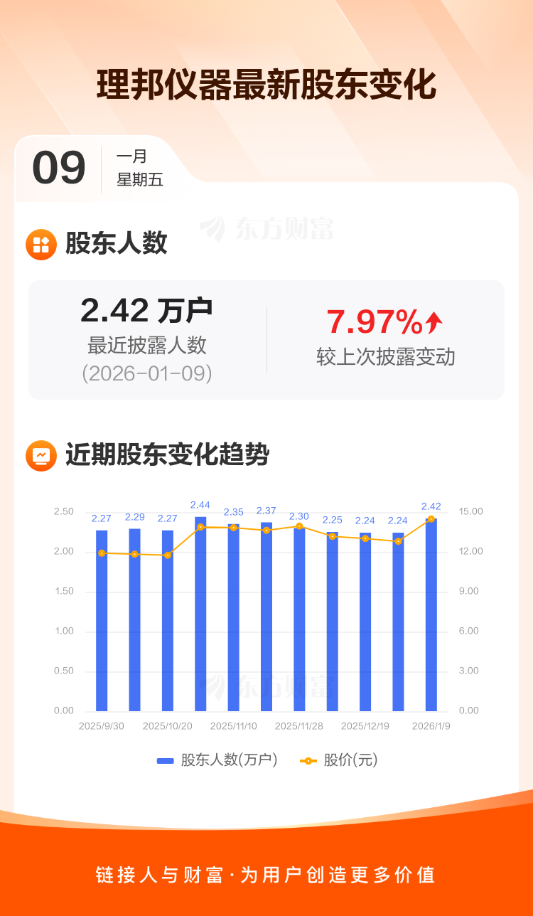 理邦仪器:截至1月9日最新股东户数2.42万户,较上期增加7.97%