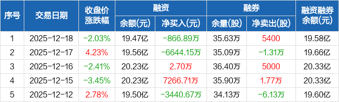 融资方面,当日融资买入8704.24万元,融资偿还9571.13万元,融资净偿还866.89万元。融券方面,融券卖出9900股,融券偿还4500股,融券余量35.63万股,融券余额1014.74万元。融资融券余额合计19.58亿元。