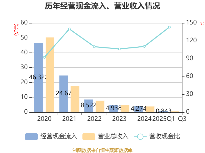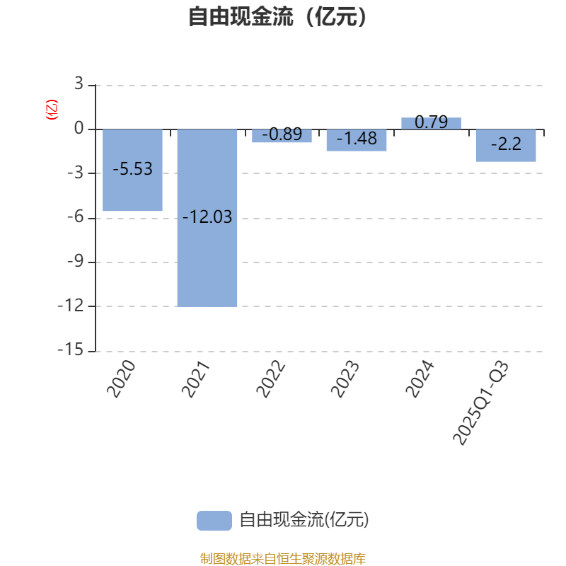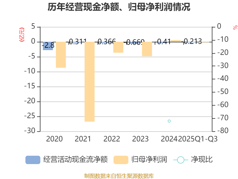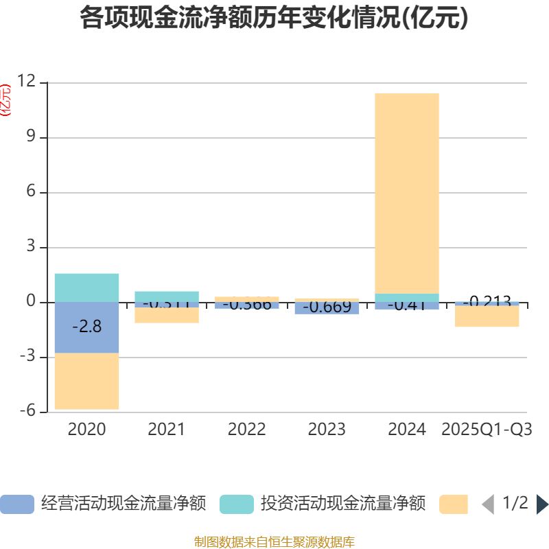 2025年前三季度,公司经营活动现金流净额为-2128.53万元,同比增加2185.62万元;筹资活动现金流净额-1.14亿元,同比减少1.12亿元;投资活动现金流净额255.76万元,上年同期为4811.86万元。