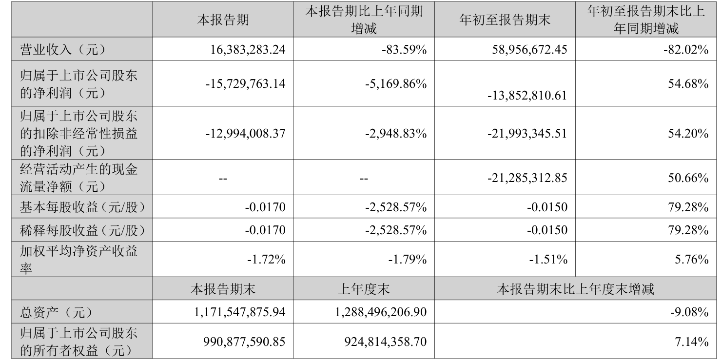 中证智能财讯有棵树(300209)1月27日披露2025年第三季度报告。前三季度公司实现营业总收入5895.67万元,同比下降82.02%;归母净利润亏损1385.28万元,上年同期亏损3056.57万元;扣非净利润亏损2199.33万元,上年同期亏损4802.08万元;经营活动产生的现金流量净额为-2128.53万元,上年同期为-4314.15万元;报告期内,有棵树基本每股收益为-0.015元,加权平均净资产收益率为-1.51%。