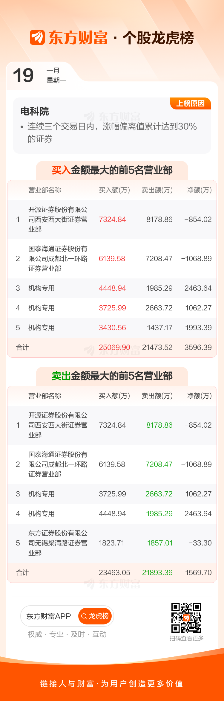 交易所2026年1月19日公布的交易公开信息显示,电科院因成为连续三个交易日内,涨幅偏离值累计达到30%的证券上榜。电科院当日收报9.52元,涨跌幅16.67%,换手率32.81%,成交额15.15亿。异常期间1月16日至1月19日,期间涨幅40.00%,累计偏离值40.35%,区间成交额21.41亿。