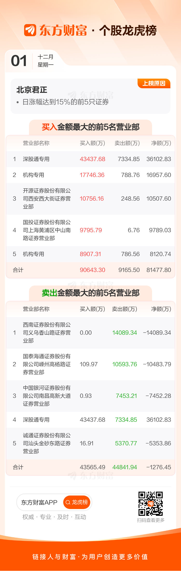交易所2025年12月1日公布的交易公开信息显示,北京君正因成为日涨幅达到15%的前5只证券上榜。北京君正当日收报95.28元,涨跌幅20.00%,偏离值20.00%,换手率16.86%,成交额62.98亿。