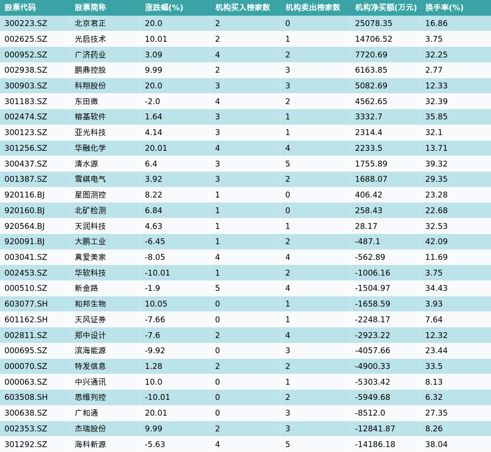 南财智讯12月1日电,南财金融终端数据显示,因当日异动登上龙虎榜的个股中,28只沪深A股龙虎榜出现了机构的身影,机构合计净买入9190.09万元,具体来看,机构净买入14只个股,净卖出14只个股。其中,机构净买入前三分别为北京君正(300223.SZ)、光启技术(002625.SZ)与广济药业(000952.SZ),详情见下图:机构净卖出的个股中,前三分别为海科新源(301292.SZ)、杰瑞股份(002353.SZ)与广和通(300638.SZ)。