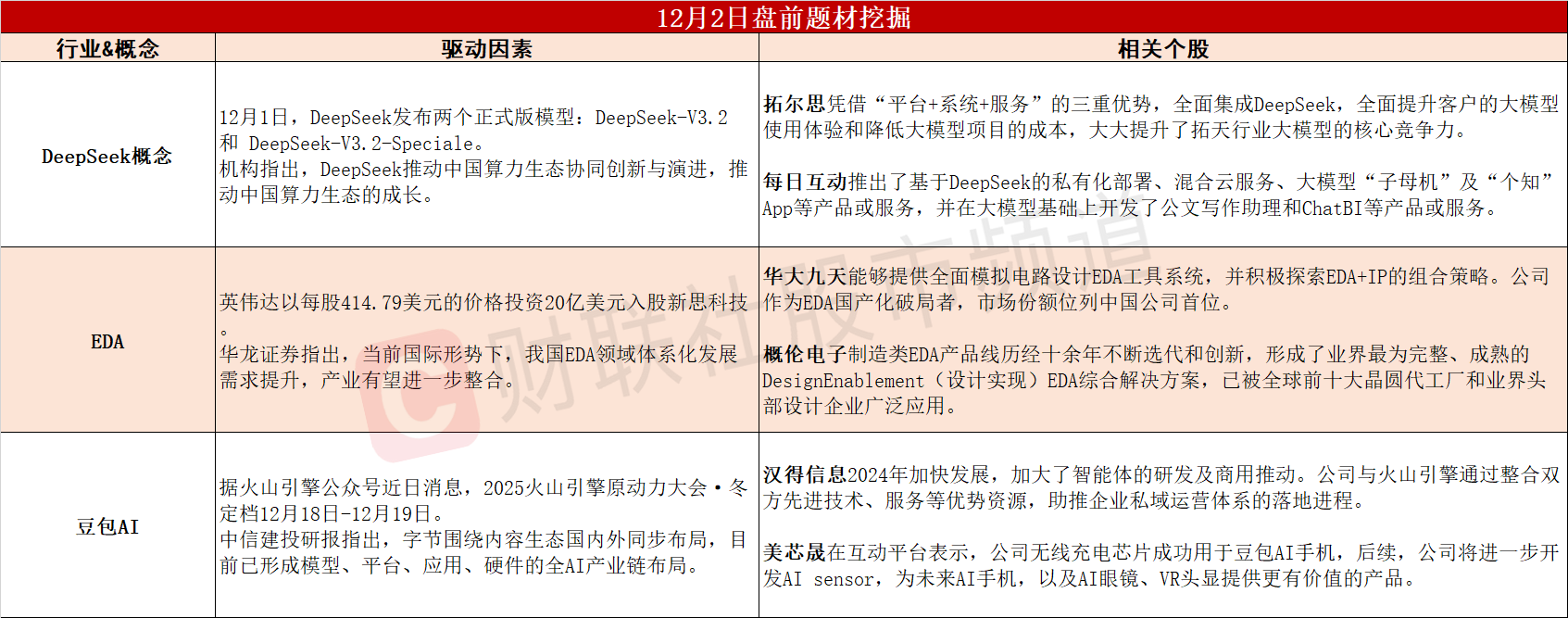 ①DeepSeek发布两款新模型,有望加速国产AI软硬件生态闭环。②英伟达豪掷20亿美元入股新思科技,EDA产业链有望迎来强催化。③火山引擎FORCE原动力大会本月召开,机构建议关注字节AI产业链。
