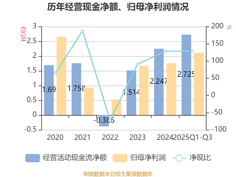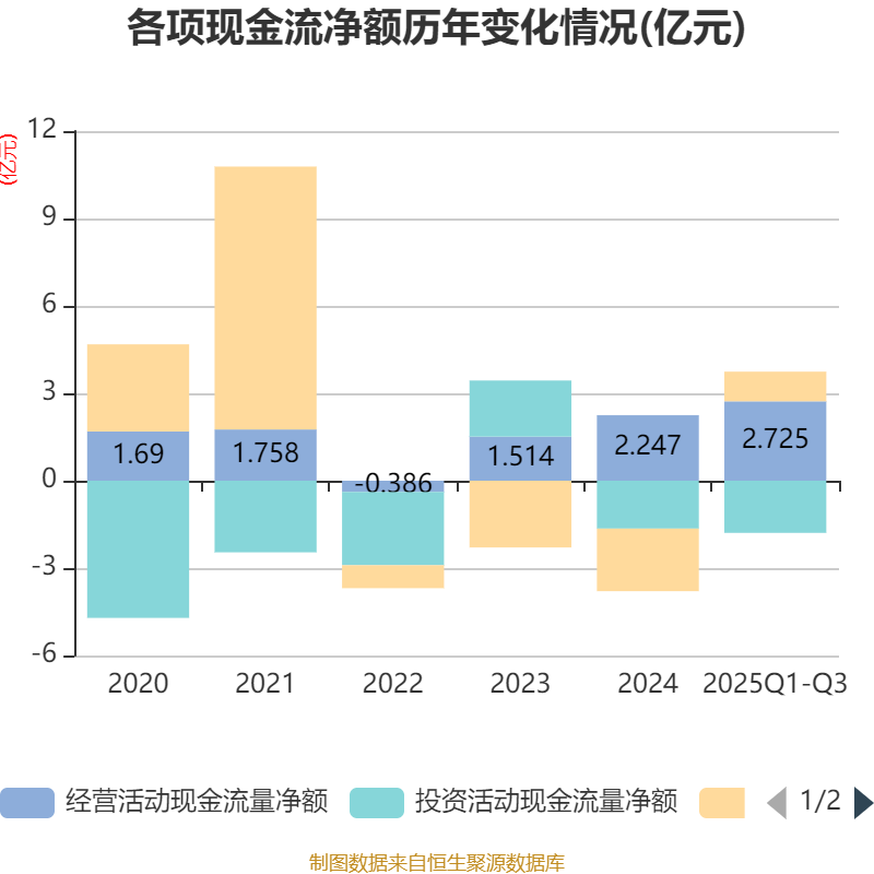2025年前三季度,公司经营活动现金流净额为2.73亿元,同比增长459.26%;筹资活动现金流净额1.02亿元,同比增加9657.98万元;投资活动现金流净额-1.79亿元,上年同期为-1.11亿元。