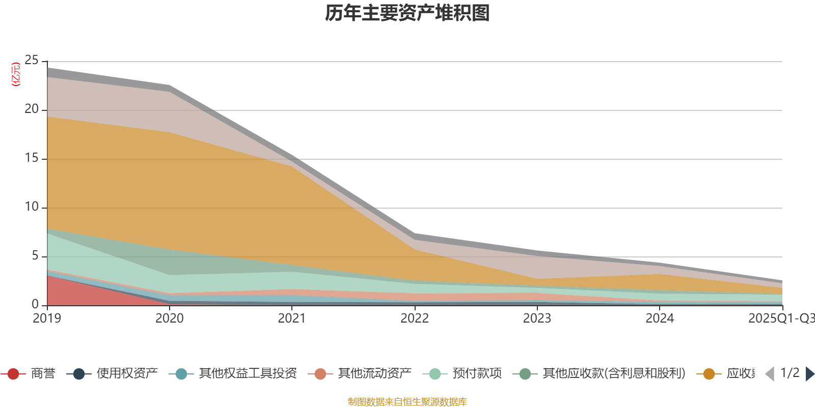资产重大变化方面,截至2025年三季度末,公司应收票据及应收账款较上年末减少61.93%,占公司总资产比重下降13.11个百分点;预付款项较上年末减少3.49%,占公司总资产比重上升10.71个百分点;其他应收款(含利息和股利)较上年末减少79.62%,占公司总资产比重下降5.54个百分点;其他权益工具投资较上年末没有变化,占公司总资产比重上升3.82个百分点。