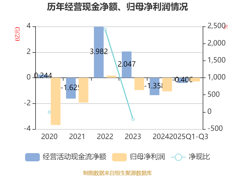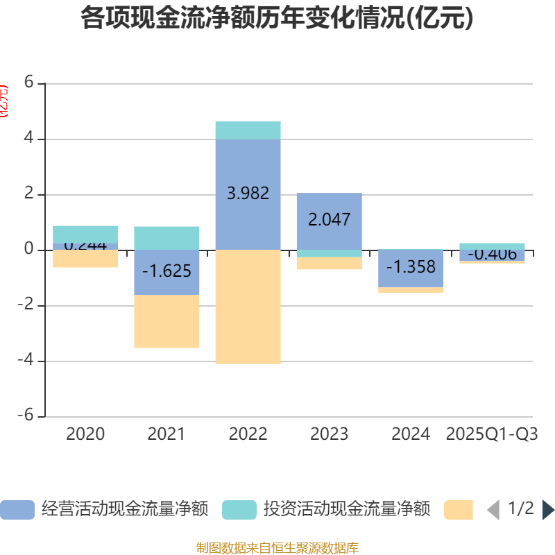 2025年前三季度,公司经营活动现金流净额为-4057.6万元,同比增加1.33亿元;筹资活动现金流净额-871.48万元,同比增加788.14万元;投资活动现金流净额2351.31万元,上年同期为219.24万元。