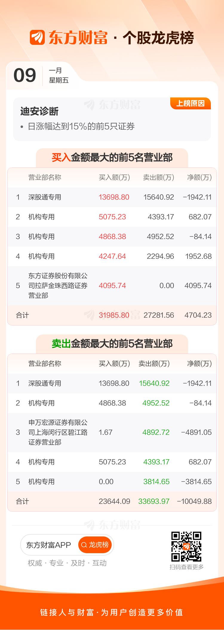 交易所2026年1月9日公布的交易公开信息显示,迪安诊断因成为日涨幅达到15%的前5只证券上榜。迪安诊断当日收报21.72元,涨跌幅20.00%,偏离值20.00%,换手率20.80%,成交额22.17亿。