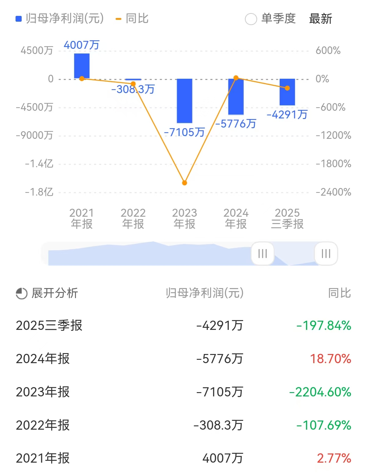 2025年三季报数据更显严峻,前三季度公司实现营业收入3.08亿元,同比增加35.80%;归母净利润进一步亏损至4291万元,同比降幅扩大至197.84%。