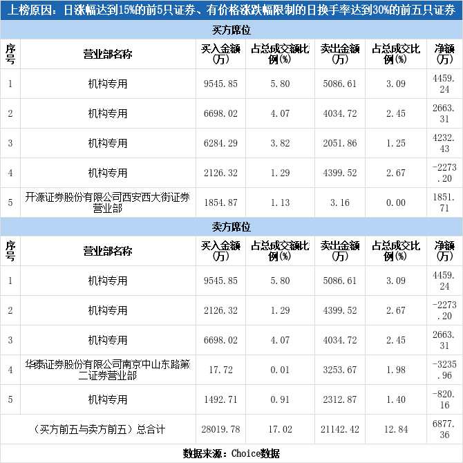 龙虎榜数据显示,今日共8个机构席位出现在龙虎榜单上,分别位列买一、买二、买三、买四、卖一、卖二、卖三、卖五,合计净买入8261.61万元,占龙虎榜净买额的120.13%。除此之外还有航天发展、和而泰、航天动力等31只个股榜单上出现了机构的身影,其中17家呈现机构净买入,获净买入最多的是和而泰,净买额为3.30亿元;14家呈现机构净卖出,其中遭净卖出最高的为航天发展,净卖额为3.64亿元。