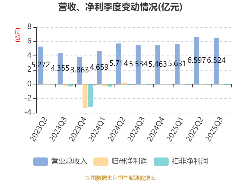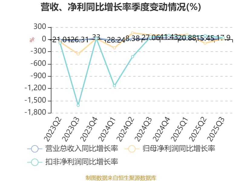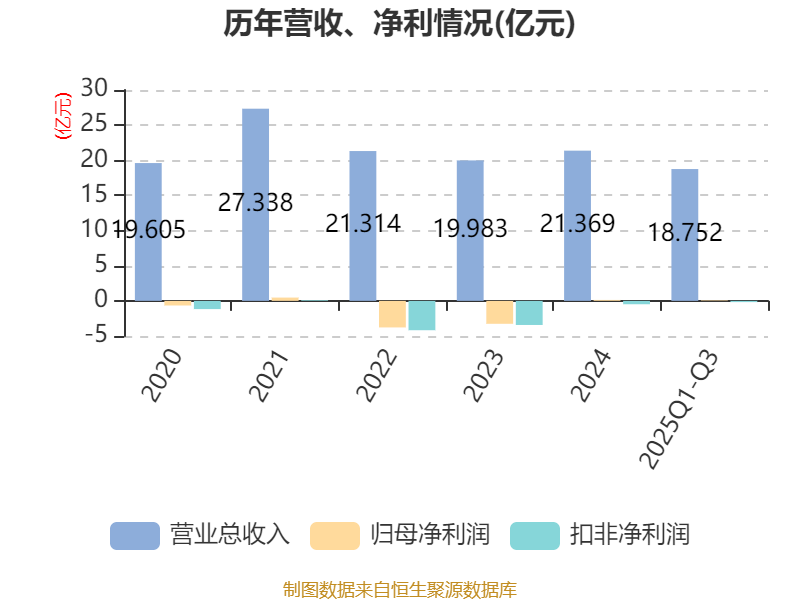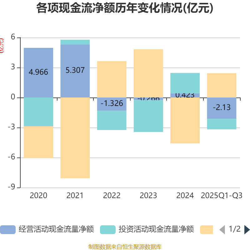 2025年前三季度,公司经营活动现金流净额为-2.13亿元,同比减少2.2亿元;筹资活动现金流净额2.43亿元,同比增加6.25亿元;投资活动现金流净额-1.05亿元,上年同期为2.27亿元。