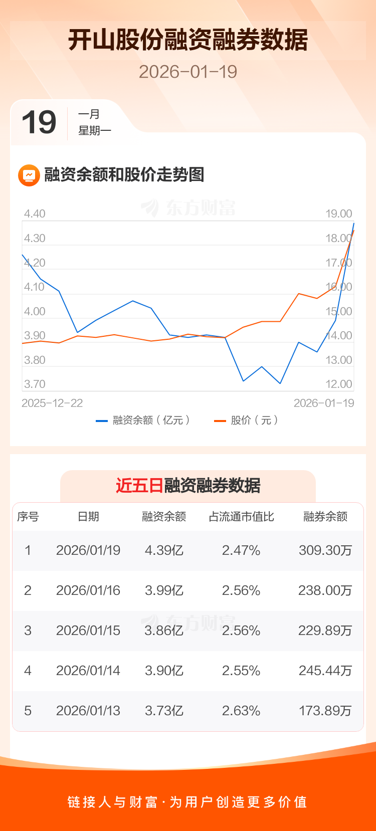 交易所最新数据显示,开山股份于2026年1月19日获融资买入8966.42万元,融资偿还4942.45万元,当日融资净买入4023.97万元。目前,该股融资余额4.39亿,占流通市值比例为2.47%。