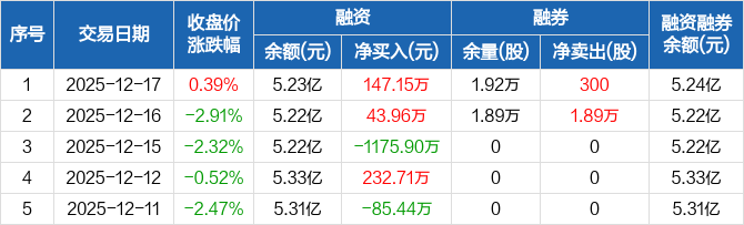 精锻科技:融资净买入147.15万元,融资余额5.23亿元(12-17)
