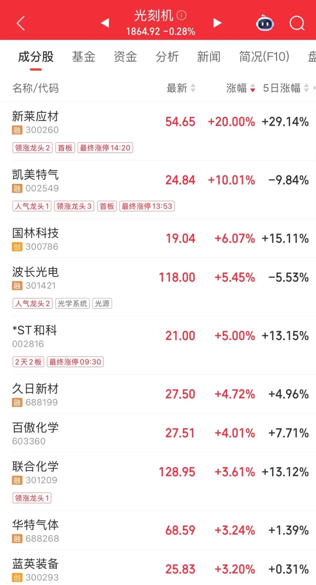 午后,光刻机概念股异动拉升,龙头股新莱应材、凯美特气涨停。